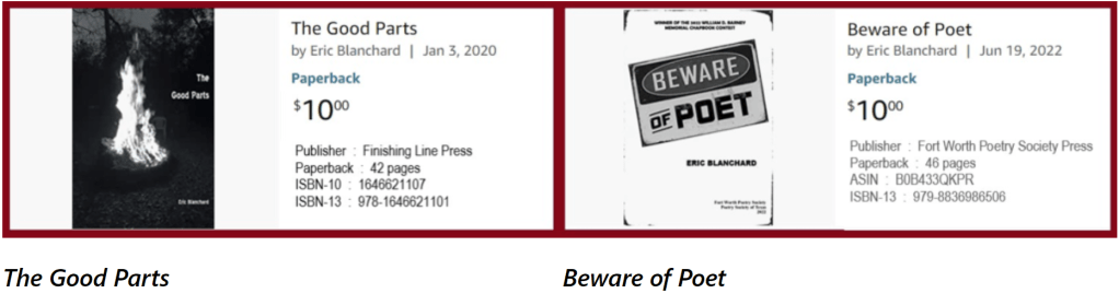 My two poetry chapbooks, The Good Parts and Beware of Poet, are available to purchase using PayPal. Be sure to provide the following information: